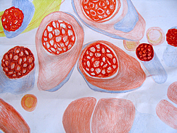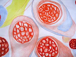 The paintings and drawings of Katarina Nestorovic direct us into the world of tissue, that which constitutes the substance of our physical being. The full complexity of this material foundation of the being is rendered visible to the human eye only when by painting it we magnify it and bring out its chemical quality. The vulnerability of this living tissue is reflected in its absence of color but which becomes softly tainted with the throbbing of stream of life giving blood. Observed through a microscope, the tissue emerges as a complex world composed of a multitude of forms which relate harmoniously and weave a world of a complex and inherent beauty.